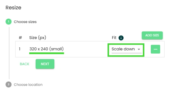 Choose size 320×240 (small) and fit “Scale down”. The image will be scaled down so it fits into these dimensions.