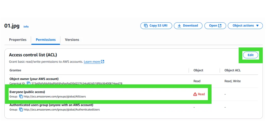 - Open the object in S3 → Permissions → Access control list (ACL) → grant Public access (Read) to Everyone (or equivalent “Object can be public” toggle).